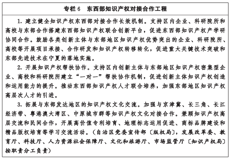 1.加强知识产权国际交流合作。积极参与“一带一路”知识产权合作项目和“一带一路”框架下知识产权协同制度研究。用好中国—阿拉伯国家博览会(以下简称中阿博览会)云上展厅等线上平台和银川综合保税区智慧园区、进口商品展示交易中心等线下平台,提升知识产权国际交流合作的智能化、便利化水平。办好中国(宁夏)国际葡萄酒文化旅游博览会等活动,打响特色产业产品品牌。在中阿博览会、中国国际版权博览会等平台设立宁夏专题展区,讲好宁夏知识产权故事,传播好宁夏知识产权声音。积极拓展民间知识产权对外交流合作渠道,支持先进制造业、现代服务业、现代农业等企业与外资企业在知识产权领域的合作交流。鼓励支持我区企业在境外建设自主知识产权商品推广展示中心。(自治区党委宣传部〔版权局〕,发展改革委、工业和信息化厅、农业农村厅、商务厅、文化和旅游厅、外办、市场监管厅〔知识产权局〕,银川海关,贺兰山东麓园区管委会,林草局、博览局按职责分工负责)