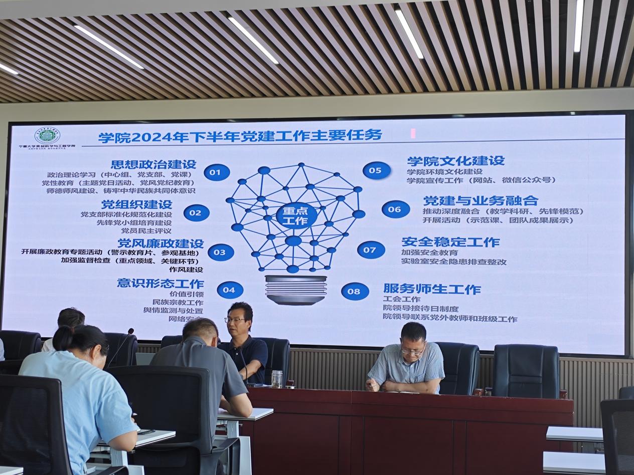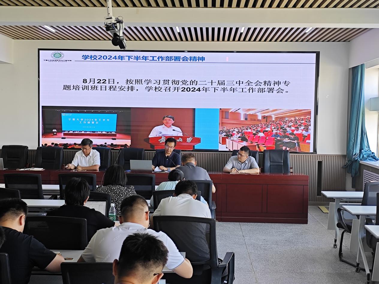 王松磊副院长对本科教学工作做出了安排部署。他强调了本科教学质量的重要性,并对本科教学评估、工程专业认证、一流教学组织建设、新专业申报、枸杞产业学院等方面的工作提出了具体要求和举措。方海田副院长就研究生教育工作做出了安排部署,并对硕士学位点获批、博士学位点申报、学院搬迁及对外交流等工作进行了汇报。